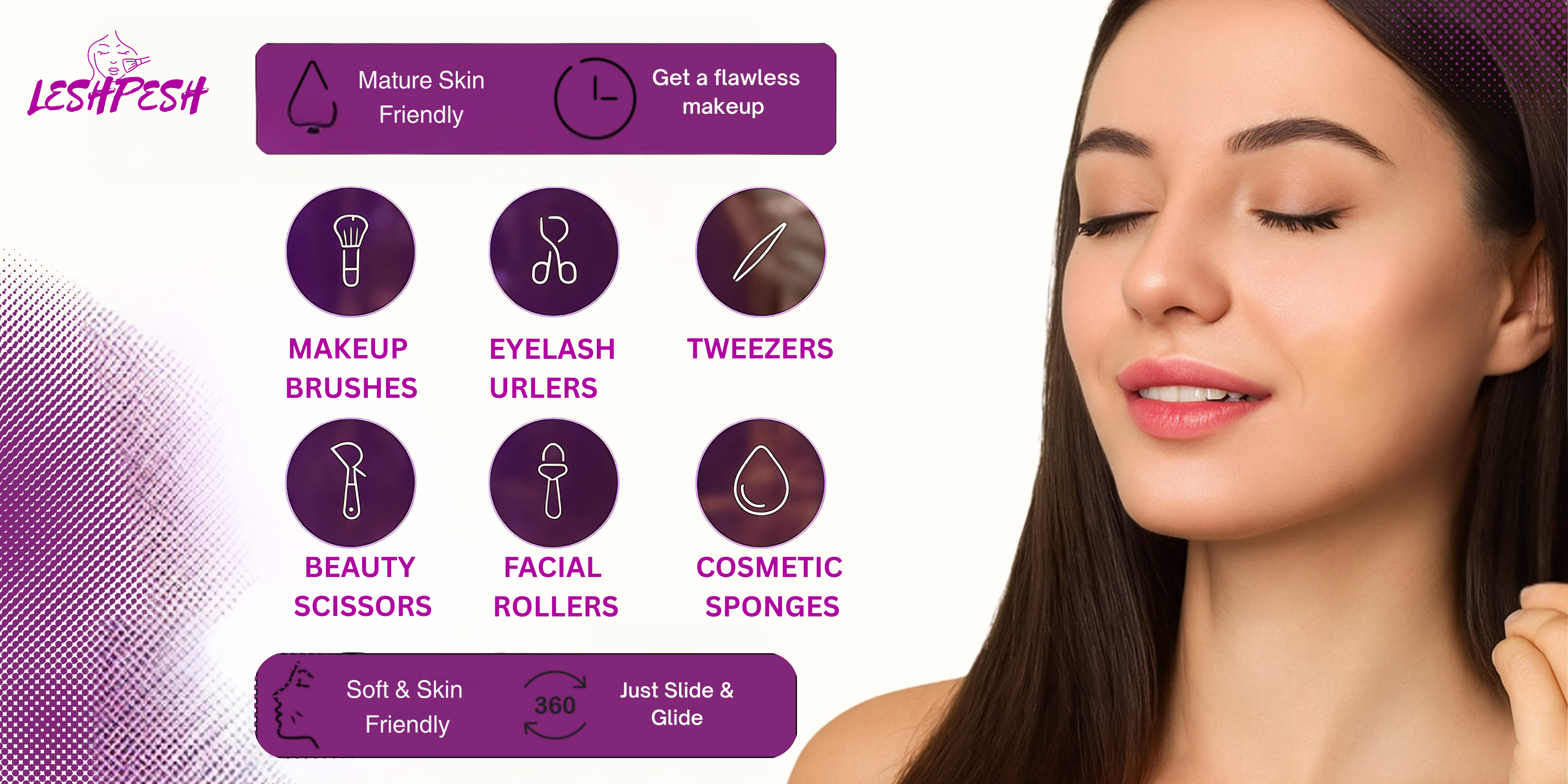 - Experience flawless, salon-quality makeup application in seconds with Leshpesh’s brush technology.